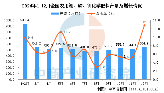 中商谍报网讯:据中商财产研究院数据库,2024年12月全国农用氮、磷、钾化学肥料(折纯)当月产量取客岁同期比拟增加。2024年12月全国农用氮、磷、钾化学肥料产量为544。9万吨,2024年1-12月全国农用氮、磷、钾化学肥料产量6006。1万吨,同比增加8。5%。