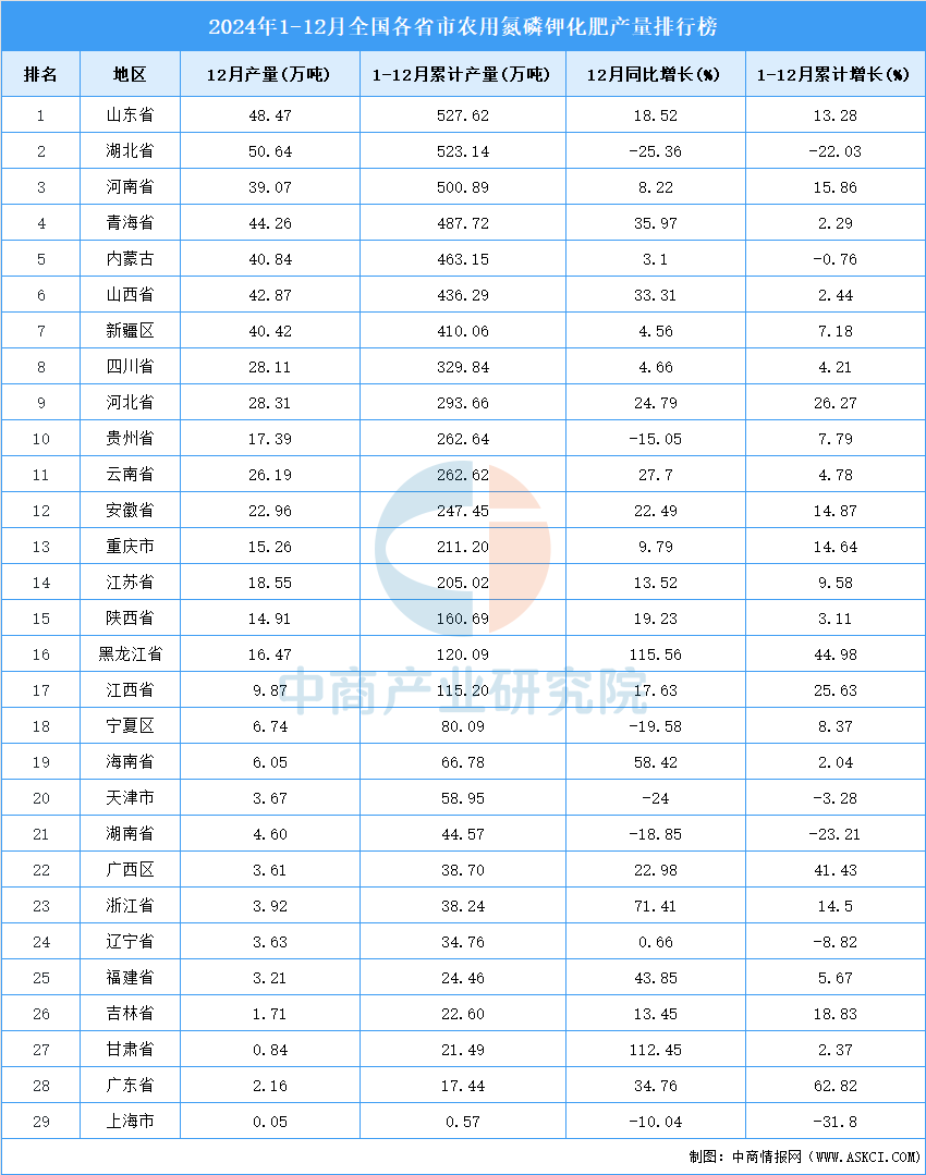 2024年全国农用氮磷钾化肥产量前十省市别离是、湖北省、河南省、青海省、、山西省、新疆区、省、此中,2024年农用氮磷钾化肥产量排名第一,累计产量为527。62万吨。