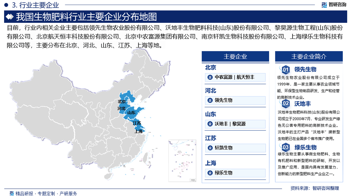 生物肥料行业合作款式较为激烈,但市场集中度逐步提高。行业内已出现出一批具有影响力的领军企业,这些企业凭仗强大的手艺实力和品牌影响力,正在市场上占领了领先地位。新兴企业也正在积极寻求立异冲破,通过差同化合作策略提拔市场份额。目前,沃地丰生物肥料科技(山东)股份无限公司、黎昊源生物工程(山东)股份无限公司、航天恒丰科技股份无限公司、中农富源集团无限公司、南京轩凯生物科技股份无限公司、上海绿乐生物科技无限公司、天津开辟区坤禾生物手艺无限公司、雷邦斯生物手艺()无限公司、江苏辉丰生物手艺无限公司等。