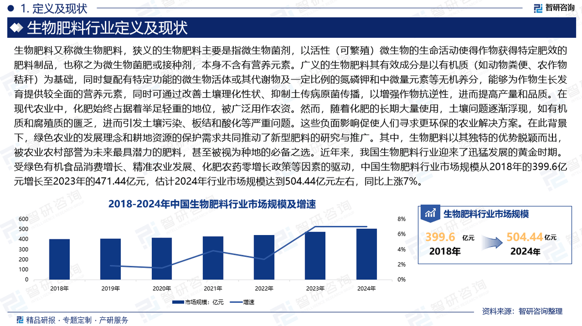 生物肥料又称微生物肥料,狭义的生物肥料次要是指微生物菌剂,以活性(可繁衍)微生物的生命勾当使得做物获得特定肥效的肥料成品,也称之为微生物菌肥或接种剂,本身不含有养分元素。广义的生物肥料其无效成分是以无机质(如动物粪便、农做物秸秆)为根本,同时复配有特定功能的微生物活体或其代谢物及必然比例的氮磷钾和中微量元素等无机养分,可以或许为做物发展发育供给较全面的养分元素,同时可通过改善土壤理化性状、土传病原菌,以加强做物抗逆性,进而提高产量和质量。广义的生物肥料涵盖农业微生物菌剂、生物无机肥、复合微生物肥料。生物肥料按照其功能感化分歧,能够分成以下几大类:(1)有固氮感化的菌肥,包罗根瘤菌肥料、固氮菌肥料、固氮蓝藻等;(2)分化土壤中难溶性矿物的菌肥,包罗溶磷菌、解钾菌等;(3)分化土壤无机物菌肥,将无机物料腐解、构成无机肥料、添加土壤无机质和土壤肥力,包罗无机磷细菌肥料、复合细菌肥料;(4)推进做物对土壤养分操纵的菌肥,包罗菌根菌肥料等;(5)加强做物抗逆性的肥料,病虫害发生、抗倒伏、抗旱、抗寒及降服连做妨碍,包罗抗生菌肥等;(6)刺激做物发生发展激素的肥料,发生各类活性物质如赤霉素、吲哚乙酸、推进做物发展;(7)土壤改良和修复,间接或间接地降低土壤中有毒无害物质浓度的肥料;(8)改善农产物质量的肥料,包罗改善农产物外不雅目标和内正在质量目标的肥料。正在现代农业中,化肥一直占领着举脚轻沉的地位,被普遍用做农资。然而,跟着化肥的持久大量利用,土壤问题逐步浮现,如无机质和腐殖质的匮乏,进而激发土壤污染、板结和酸化等严沉问题。这些负面影响促使人们寻求更环保的农业处理方案。正在此布景下,绿色农业的成长和耕地资本的需求配合鞭策了新型肥料的研究取推广。此中,生物肥料以其奇特的劣势脱颖而出,被农业农村部誉为将来最具潜力的肥料,以至被视为种地的必备之选。近年来,我国生物肥料行业送来了迅猛成长的黄金期间。受绿色无机食物消费增加、精准农业成长、化肥农药零增加政策等要素的驱动,中国生物肥料行业市场规模从2018年的399。6亿元增加至2023年的471。44亿元,估量2024年行业市场规模达到504。44亿元摆布,同比上涨7%。