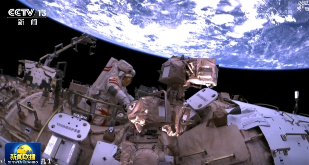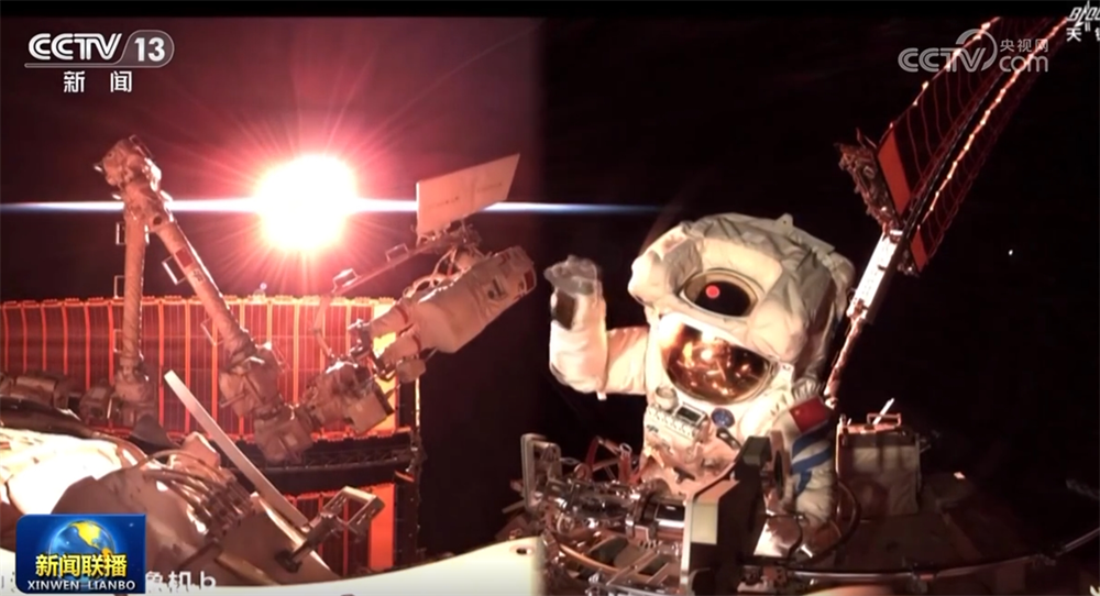 机械臂活动至上下臂点,蔡旭哲登上机械臂。航天员宋令东正在出舱舱口将气闸舱防护安拆传送给蔡旭哲。