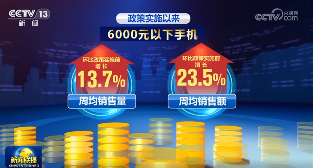 政策实施以来,6000元以下手机周均发卖量、发卖额环比政策实施前别离增加13。7%、23。5%。