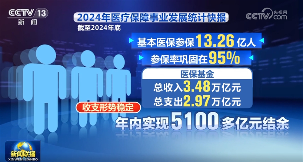 近日,国度医保局发布2024年医疗保障事业成长统计快报。截至2024岁尾,根基医保参保13。26亿人,参保率巩固正在95%,医保基金总收入3。48万亿元,总收入2。97万亿元,年内实现5100多亿元节余,出入形势不变。