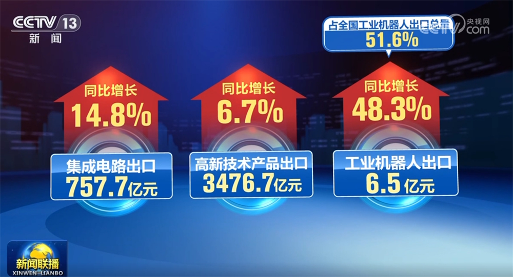 此中,集成电出口757。7亿元,同比增加14。8%;高新手艺产物出口3476。7亿元,同比增加6。7%;工业机械人出口6。5亿元,同比增加48。3%,占全国工业机械人出口总量的一半以上,达到51。6%,产物销往全球82个国度和地域。